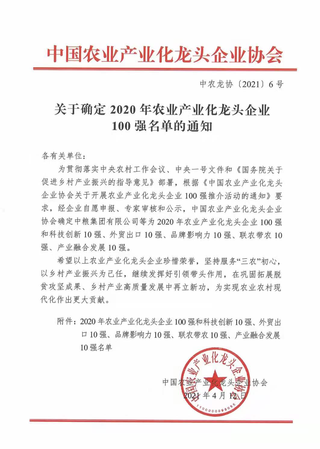 4月25日,2020年農業產業化龍頭企業百強推介暨百強國龍進貴州活動舉行。活動公布了2020年農業產業化龍頭企業100強名單。石羊集團獲評2020年農業產業化龍頭企業100強,榮列百強榜單第75位。